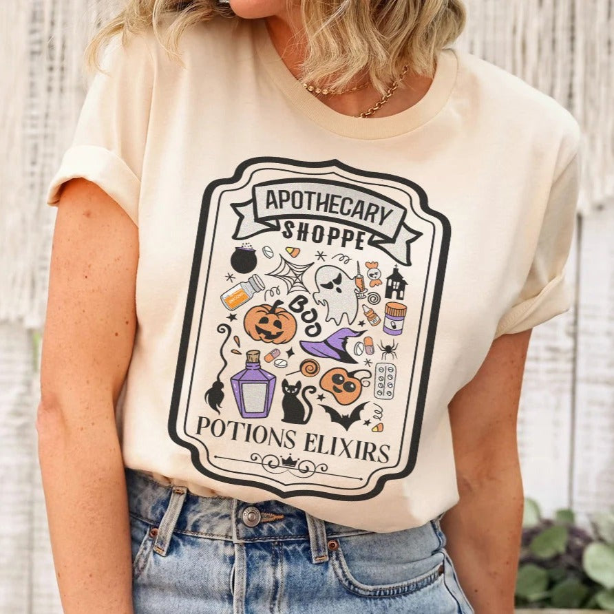 It's time to work your magic and cast spells with our "Apothecary Shoppe" Halloween tee. Because who needs a cauldron when you've got a pharmacy full of magical potions and a wicked sense of humor?