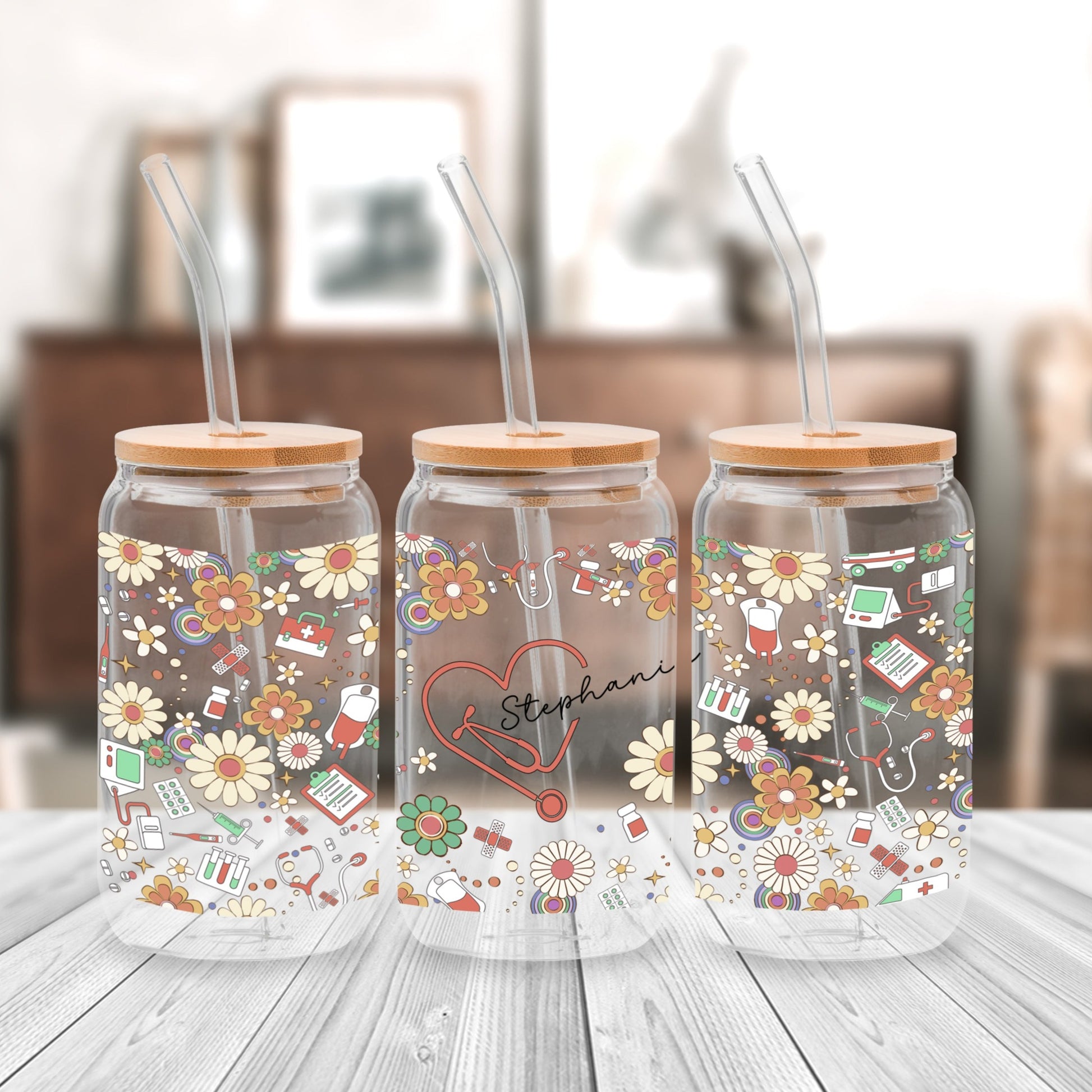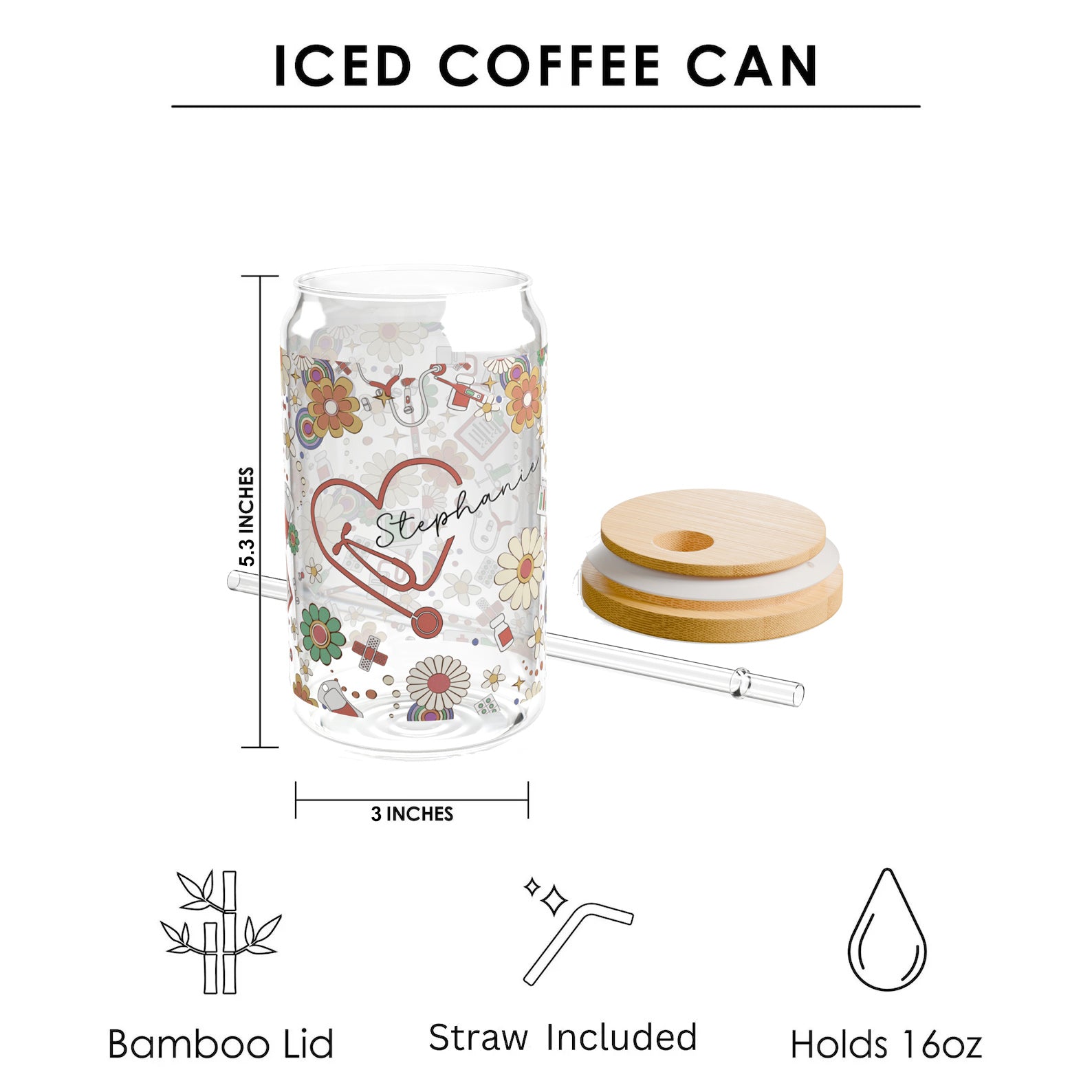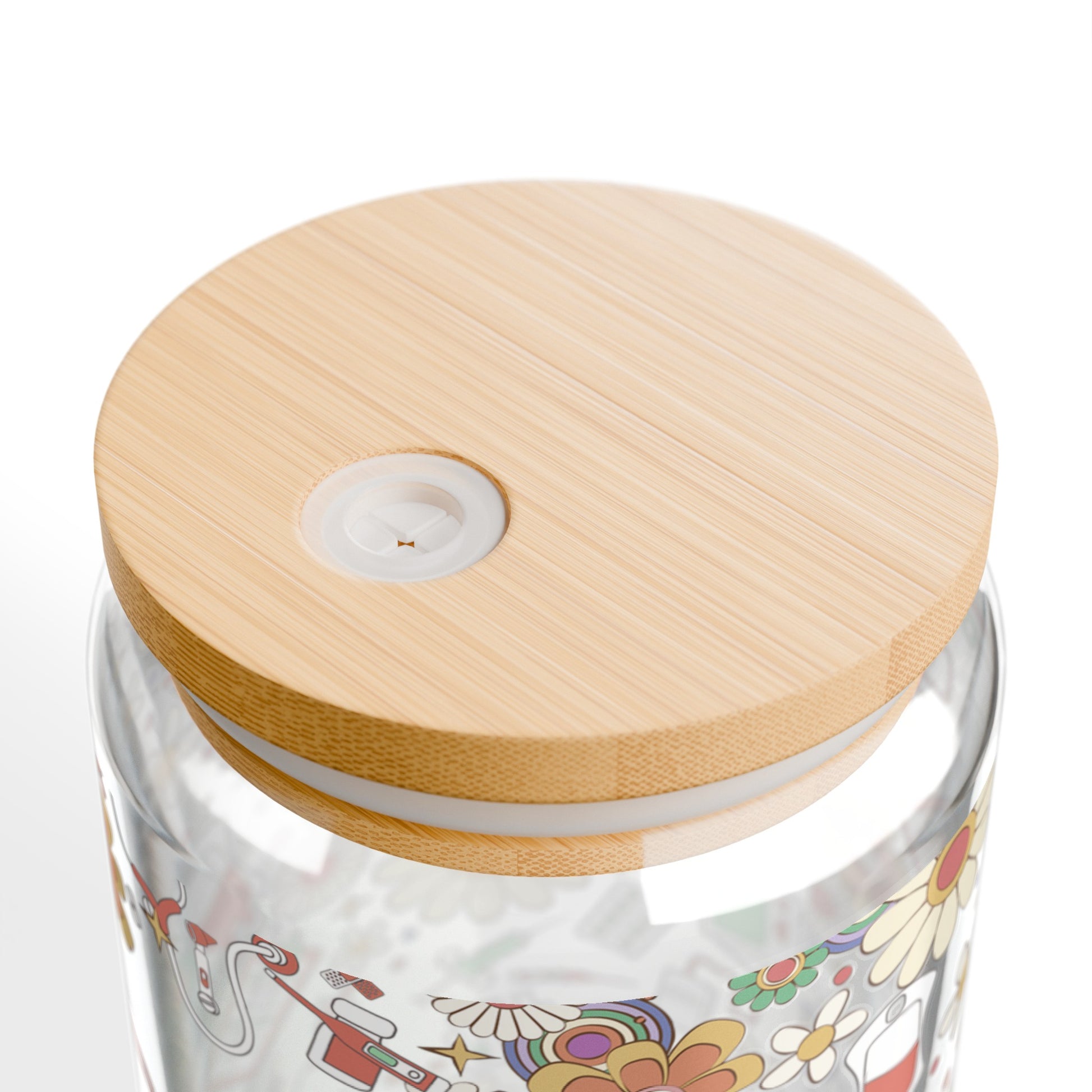 Custom Retro Medical Doodles 16oz Glass with Bamboo Lid
