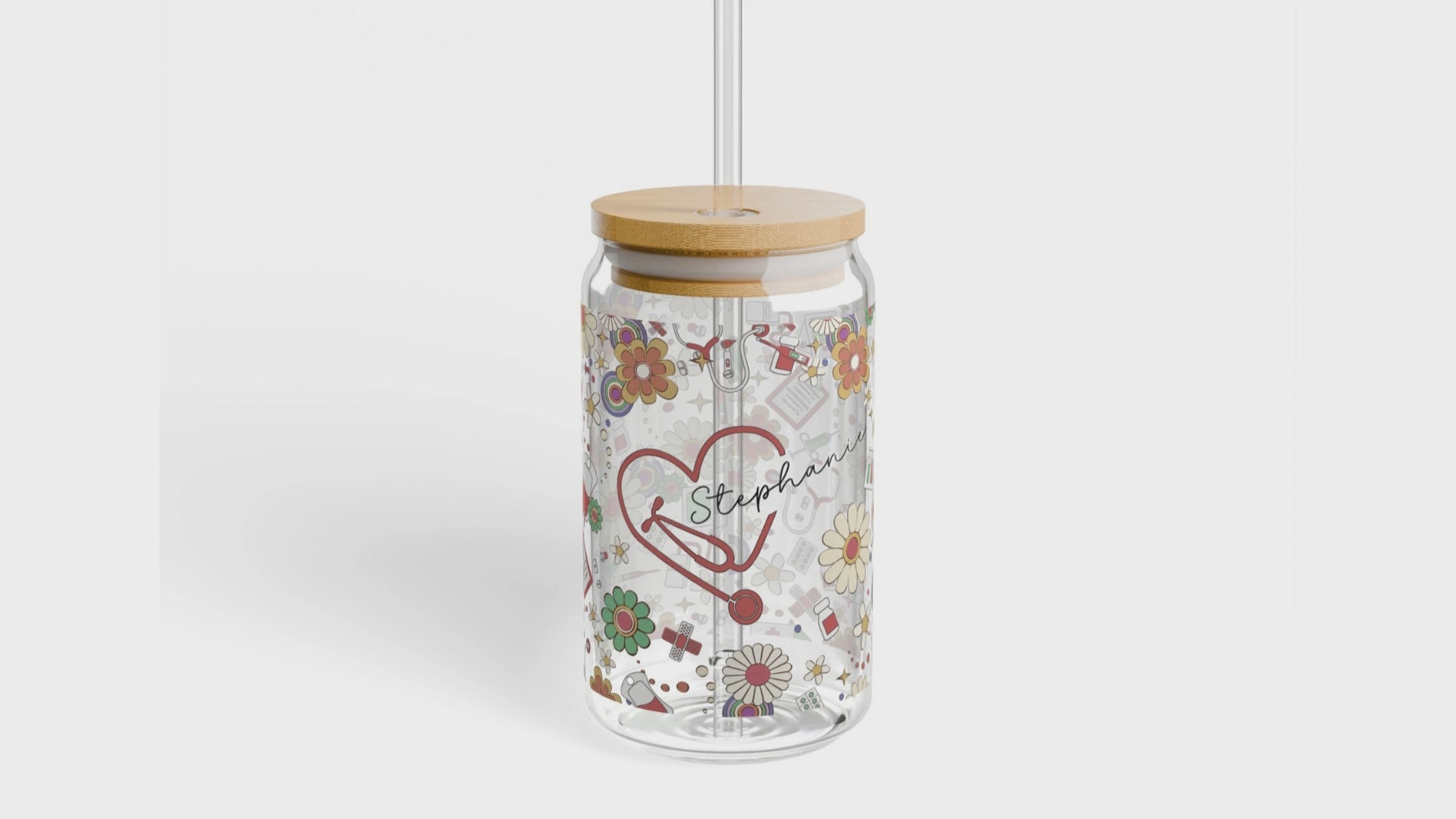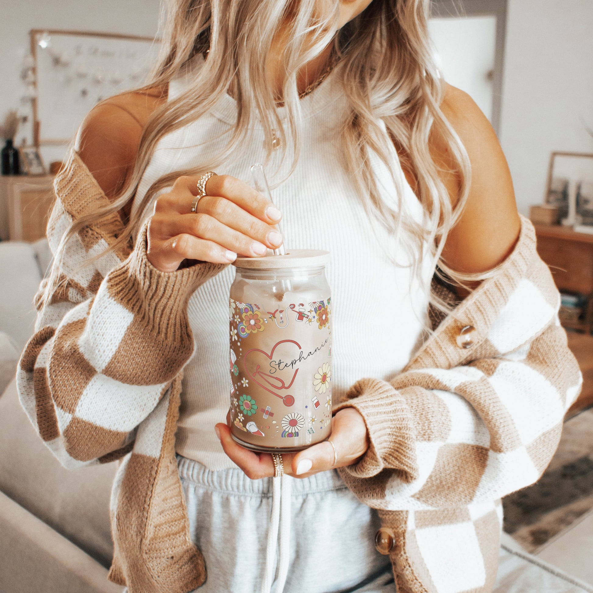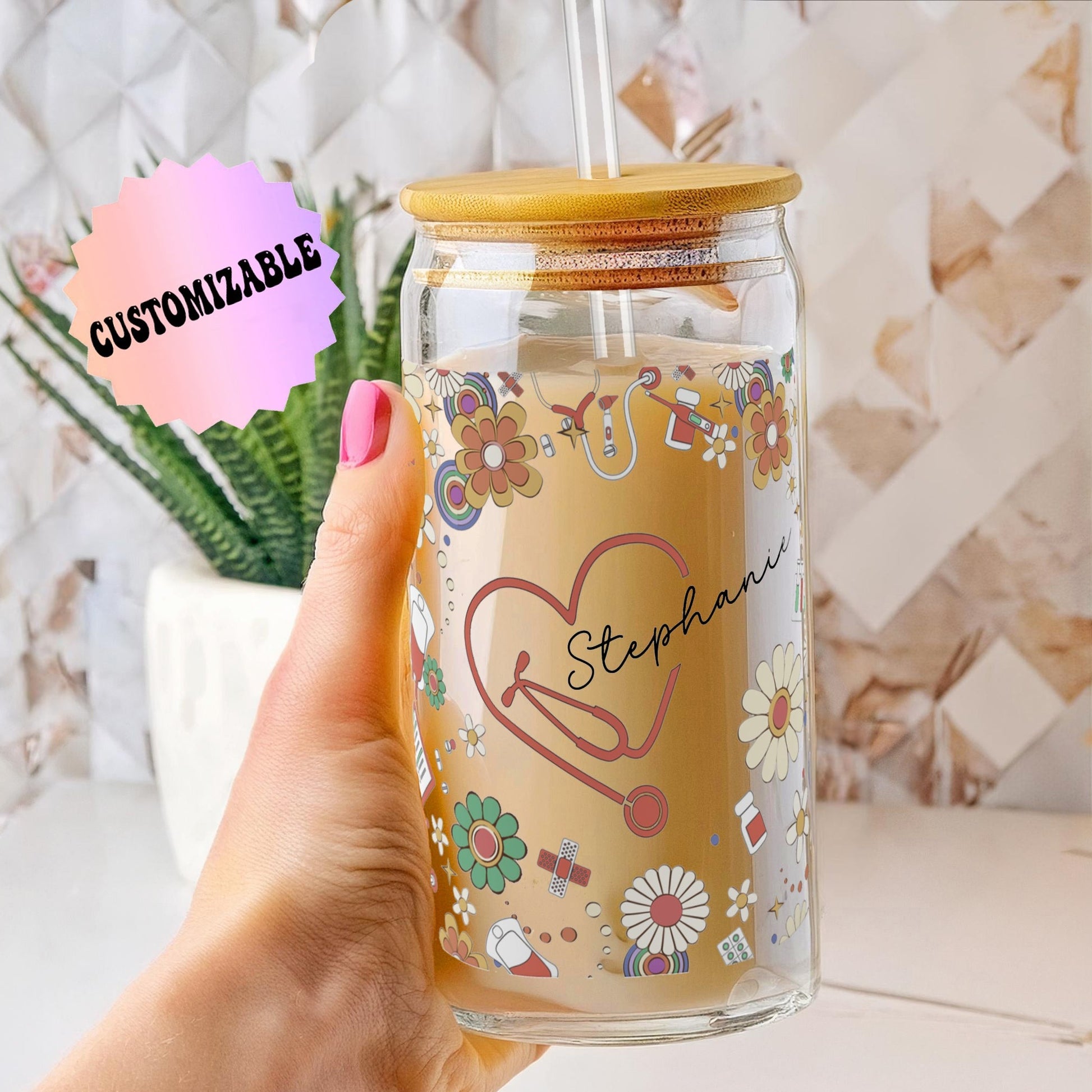 Custom Retro Medical Doodles 16oz Glass with Bamboo Lid